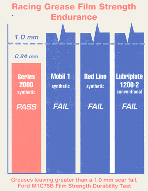 AMSOIL Series 2000 Racing Grease passes the Ford Film Strength Endurance Test with a 16 point margin (see graph). Most nonsolid-fortified racing greases, synthetic or conventional, do not pass. AMSOIL Series 2000 Racing Grease keeps greased components in like-new condition.