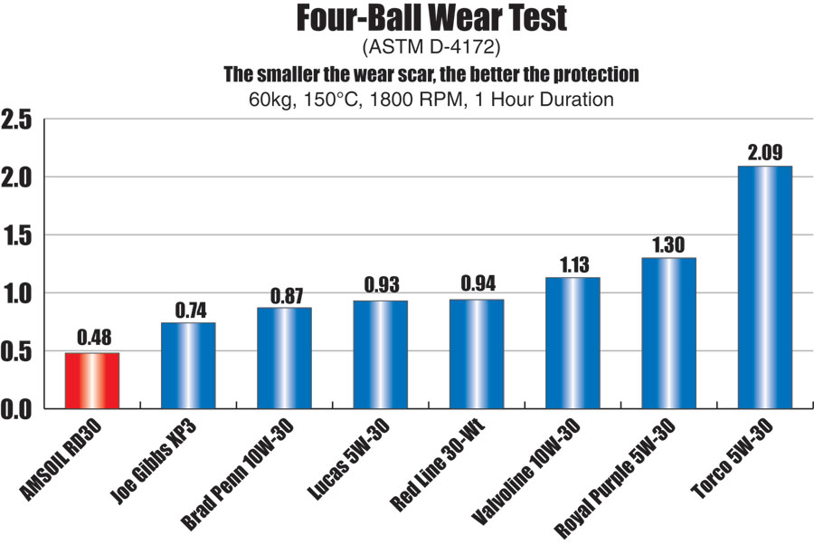 AMSOIL Dominator Racong Oil 10W-30 4-ball Wear Test AMSOIL Dominator Synthetic Racing Oil features an additive package heavily fortified with zinc and phosphorus for superior long-term wear protection. Designed for maximum durability, it ensures critical engine components are protected for the duration of the race. Dominator Synthetic 10W-30 Racing Oil's superior additive technology provides unmatched durability in extreme conditions. In addition, its high levels of zinc and phosphorus additives make it ideal for street rods, muscle cars and other vehicles with flat-tappet cams.